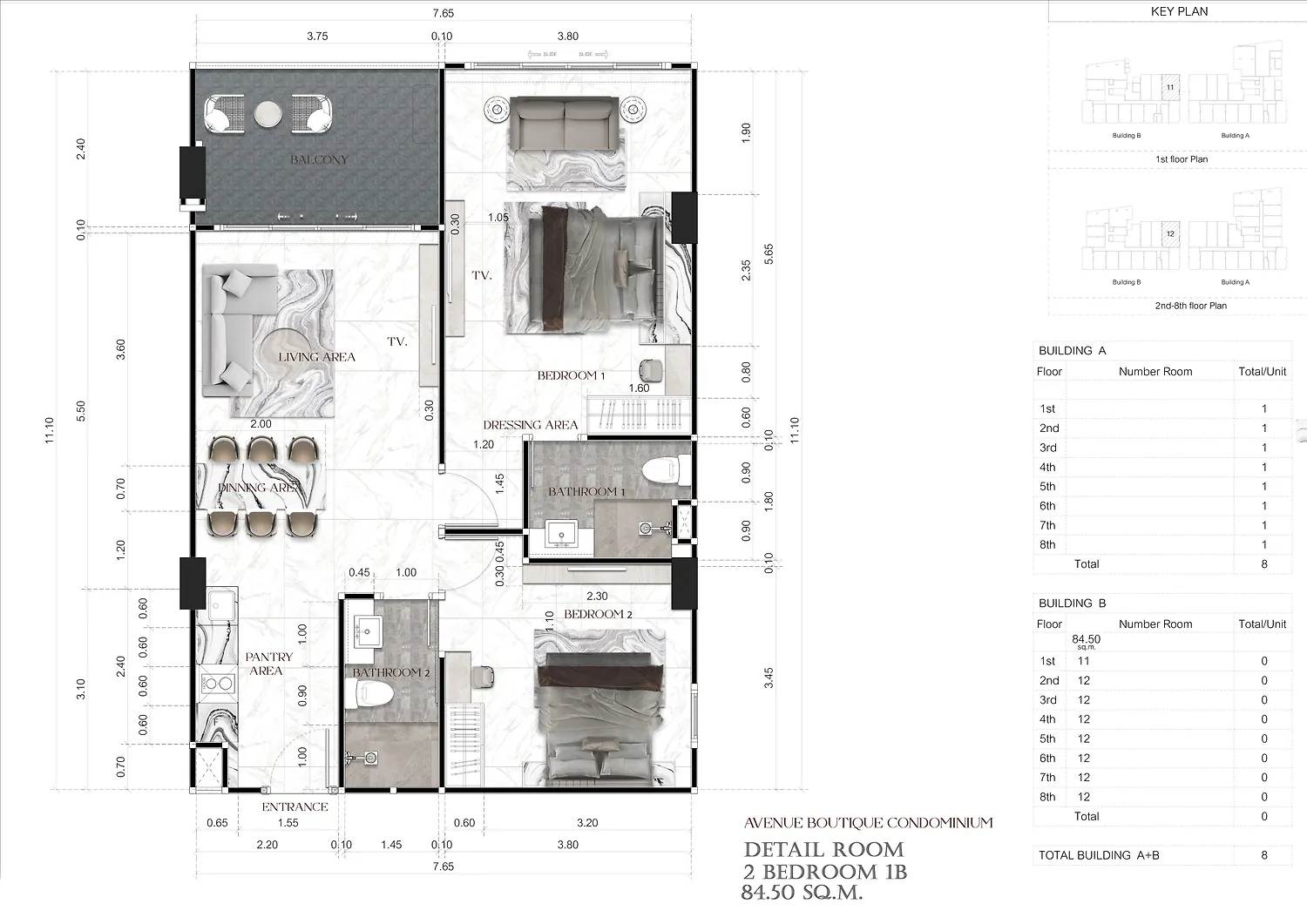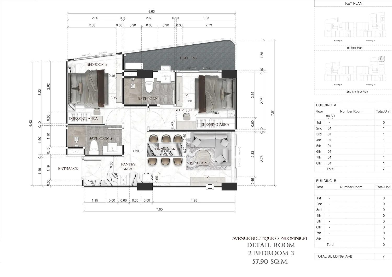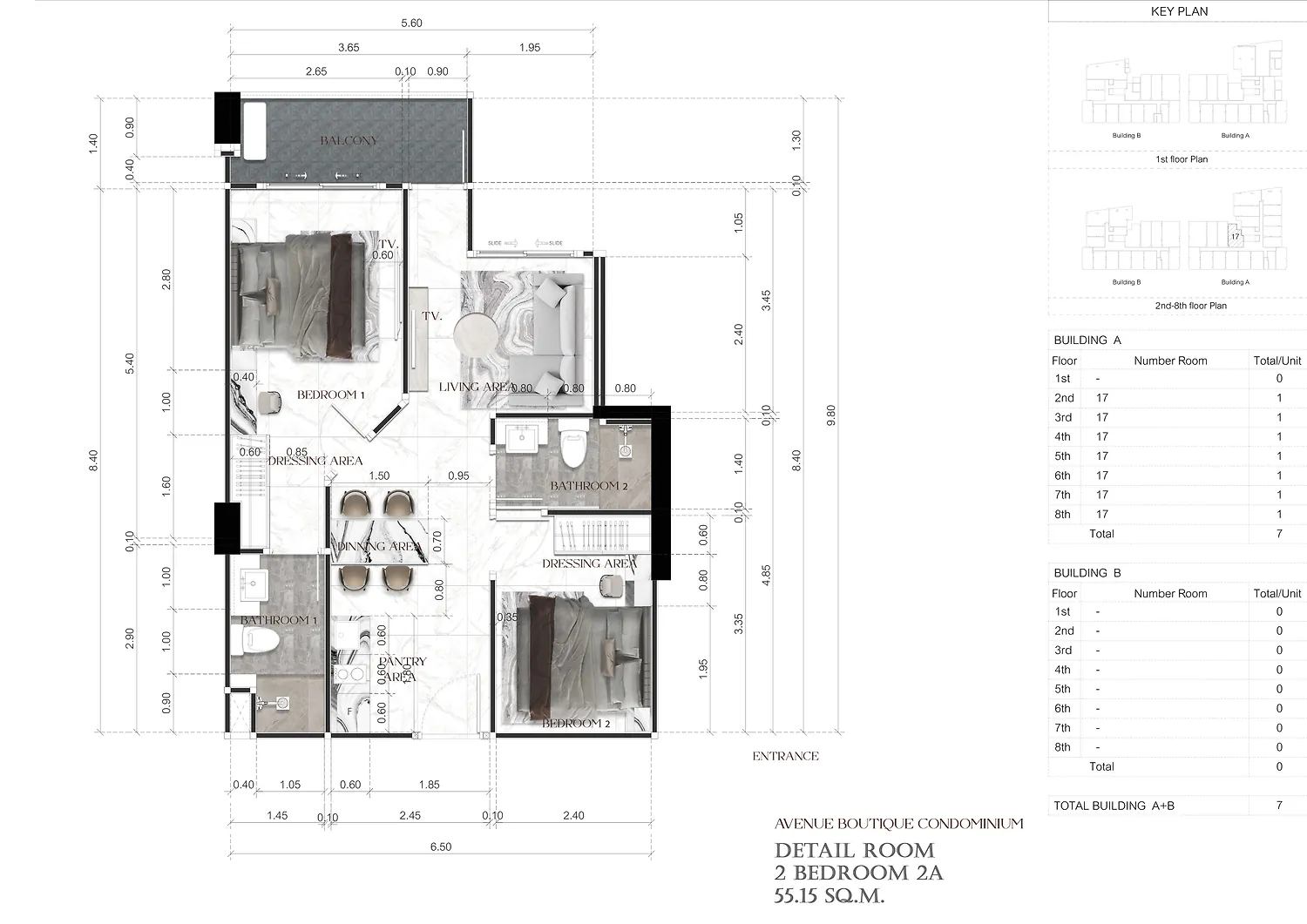 | 2 Bedrooms | 55.15–84.5 | 6 810 000 ฿ |