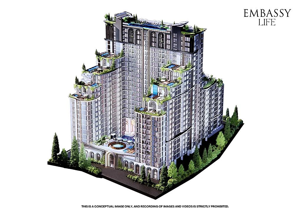 Embassy Life расположен в районе Jomtien и задуман как современный жилой комплекс, где основной акцент сделан на удобство повседневной жизни и насыщенную внутреннюю инфраструктуру. По данным PattayaRealty, проект включает 24 этажа и 474 квартиры, предусмотрен подземный уровень и общественные пространства для резидентов.
