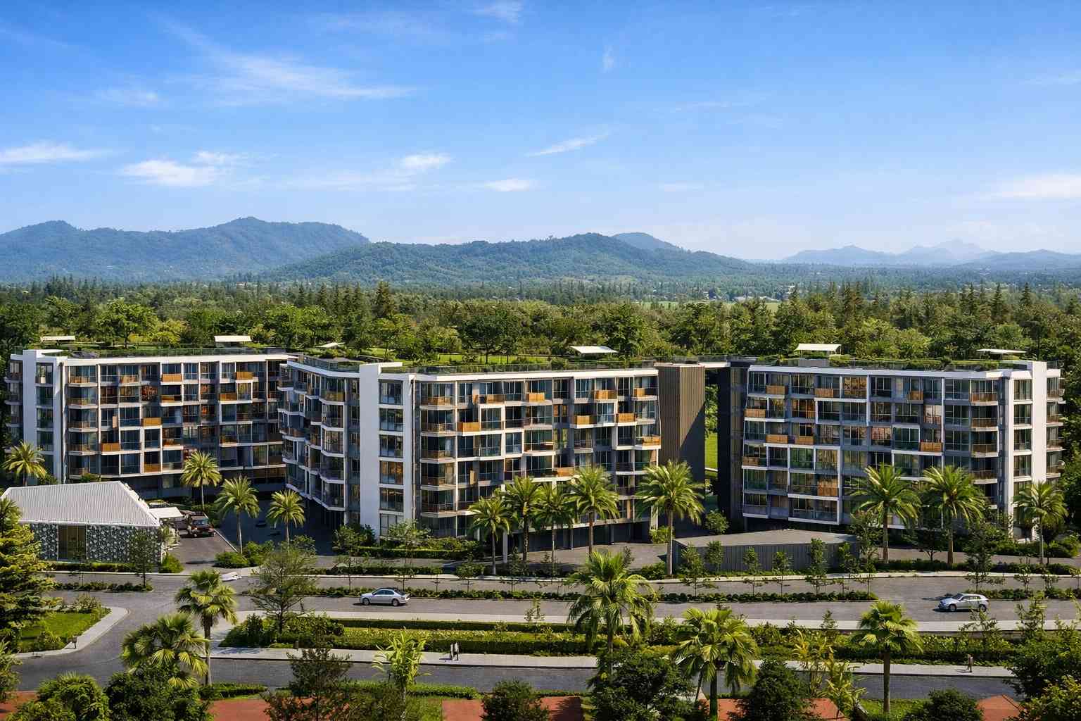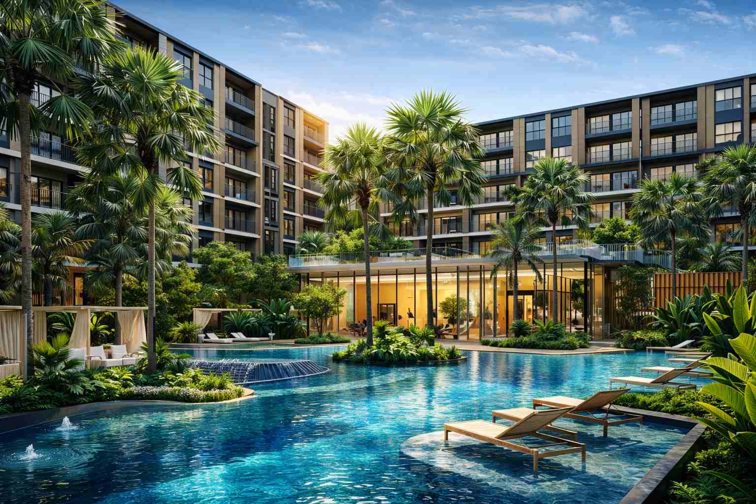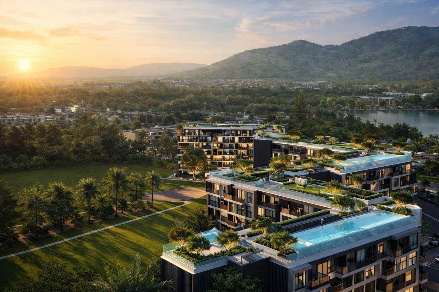 Sunny Moon — новый жилой комплекс в районе Раваи на юге Пхукета. В проекте около 228 квартир: два корпуса высотой до 8 этажей, а завершение заявлено на 2026 год. До пляжа Най Харн отсюда примерно 700 метров, рядом есть озеро и прогулочная зона — это добавляет району “жизни”, а не только курортного настроения.