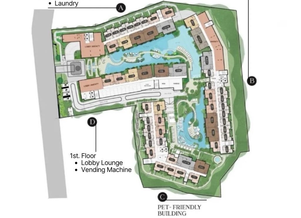 По наполнению проект выглядит довольно сильным: здесь заявлены бассейны, onsen-зона для отдыха, джакузи, 25-метровый спортивный бассейн, детская площадка, аква-зона для детей, площадка для питомцев, бассейн для животных, лужайка для йоги, смотровая площадка, коворкинг, общая кухня, кафе, спортзал, детский клуб, игровая комната, парная, сауна, прачечная, вендинговые автоматы и лобби-зоны.